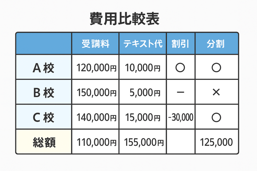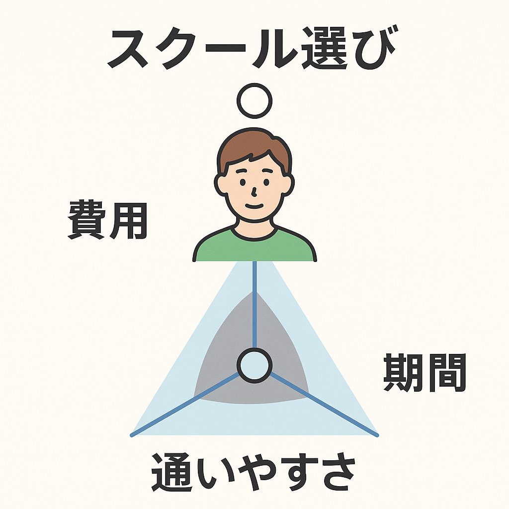 スクール選びで迷ったときは、「費用」「期間(修了までのスケジュール)」「通いやすさ(場所・時間・学習スタイル)」の3つの軸で比較するのがおすすめです。