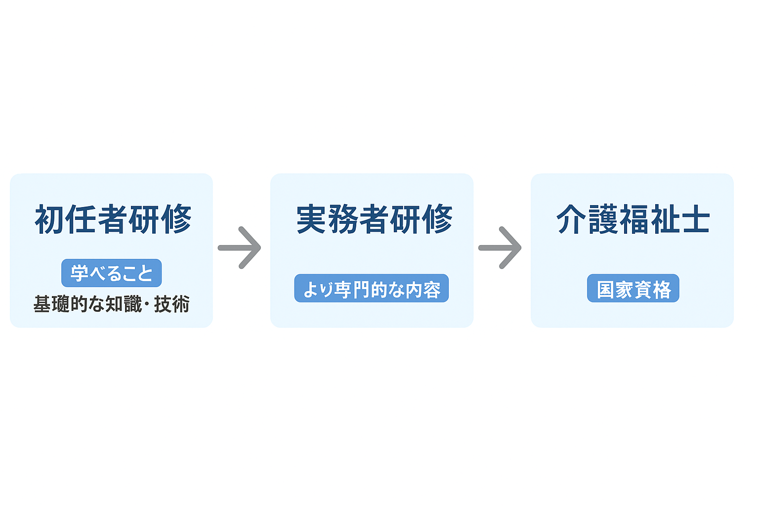 「初任者研修で土台を作り、実務者研修で応用力を身につける」というステップで考えるとイメージしやすいでしょう。