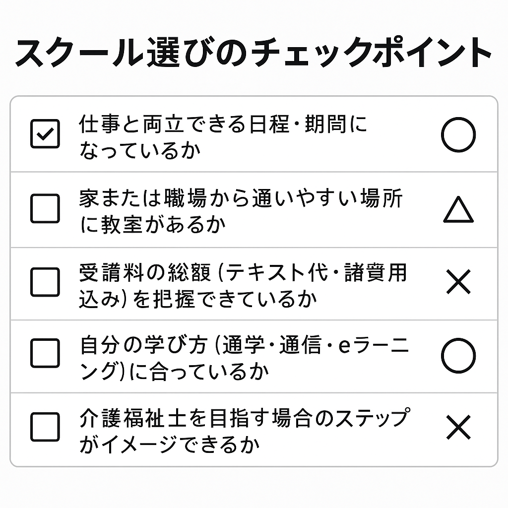 最後に、実務者研修スクールを比較するときに役立つチェックリストをまとめました。