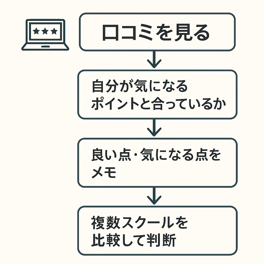 口コミを探すときは、「講師のわかりやすさ」「事務局の対応」「通いやすさ」「課題の量と難しさ」など、自分が気になるポイントに絞って見ると判断しやすくなります。