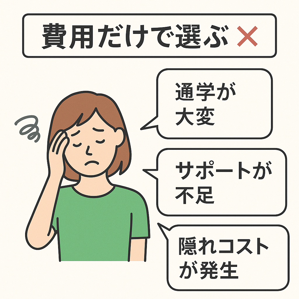 ただし、安さだけで決めると、「通いづらい」「仕事との両立が難しい」「サポートが薄くて不安」というストレスにつながることもあります。
